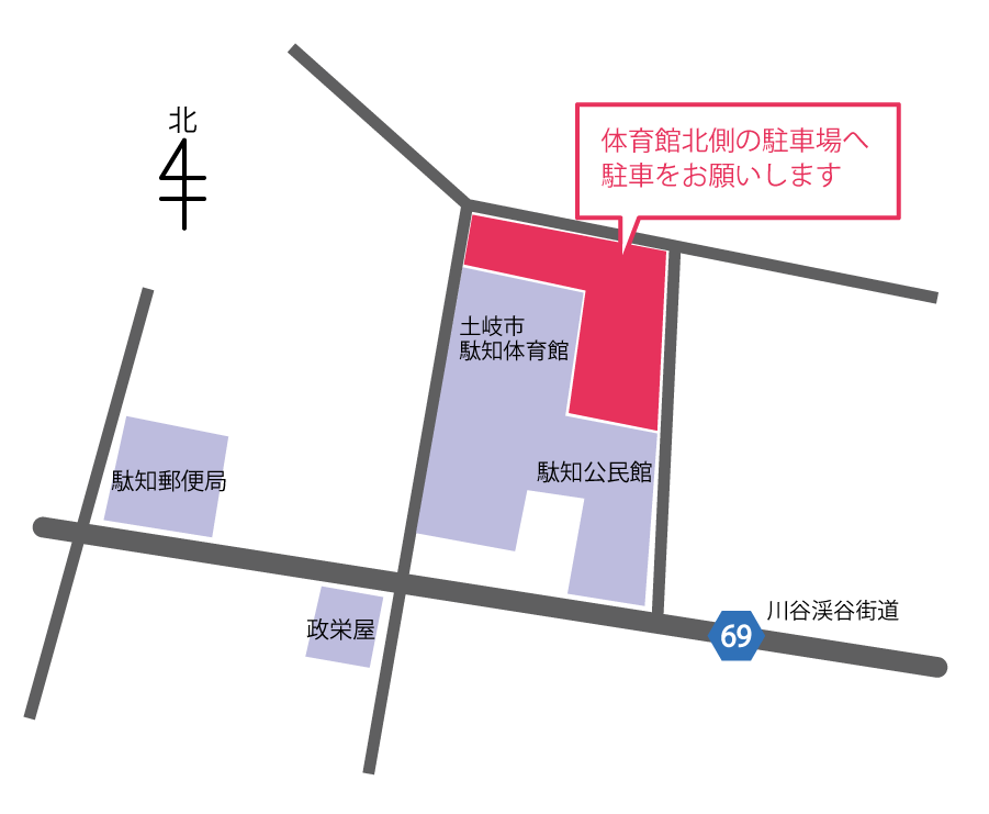 当日、駐車場をご利用の際は、駄知体育館北側の駐車場へのご駐車をお願いいたします。